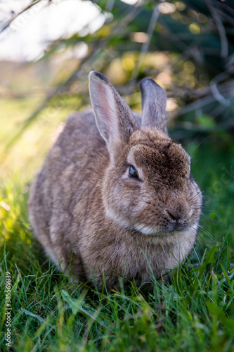 Fototapeta premium A brown bunny in the wild on a green grass on sunset looking curiously at the camera.