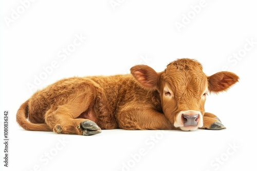 © Murda, Fototapeta premium A brown calf lying down on a white background.