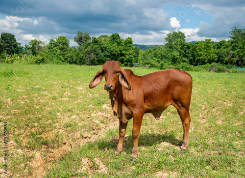© pornsawan, Fototapeta premium A brown calf standing in a field, Cute young cow standing in the fields.