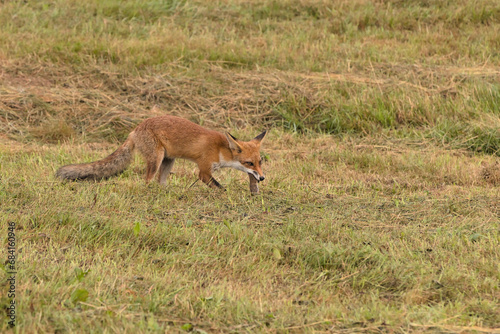 Fototapeta premium A brown fox eats a mouse on a green meadow