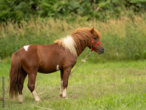 © LeeSensei, Fototapeta premium A brown Hokkaido pony stands in a lush green field.