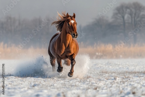 © BerkahStock, Obraz premium A brown horse galloping through snow, creating splashes and a dynamic scene in a winter landscape.
