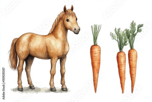 © Geraldine, Obraz premium A brown horse next to three carrots, illustrating a connection between animals and food.