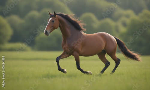 © Miklos, Obraz premium A brown horse runs through a grassy field on a sunny day