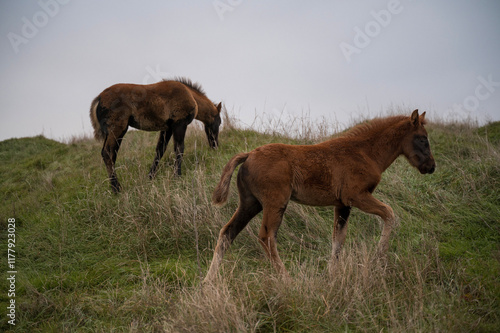 © Anna, Fototapeta premium A brown horse standing on top of a lush green field