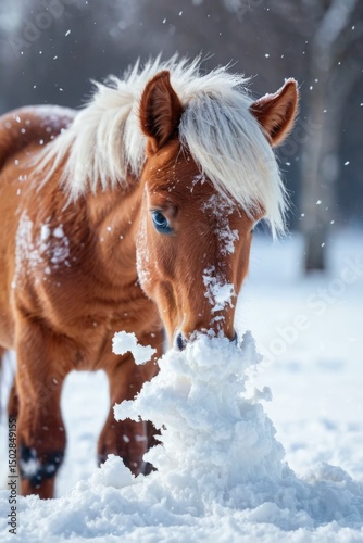 © Alla, Obraz premium A brown horse stands in the snow with its head over a pile of snow, ready to take a closer look