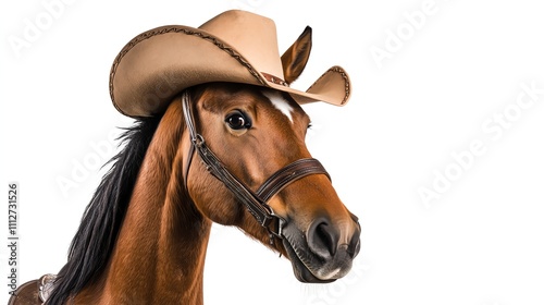 © Rstm, Fototapeta premium A brown horse wearing a cowboy hat, looking to the right.