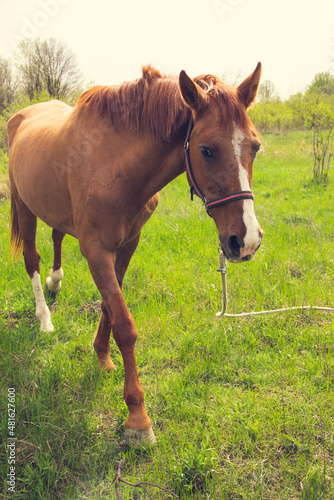 Fototapeta premium A brown horse with a light mane grazes on a leash in the steppe