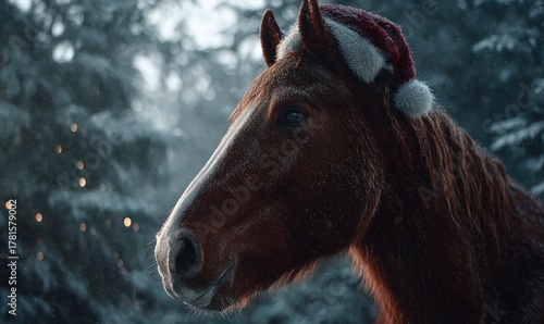 © TheoTheWizard, Obraz premium A brown horse with a red hat on its head