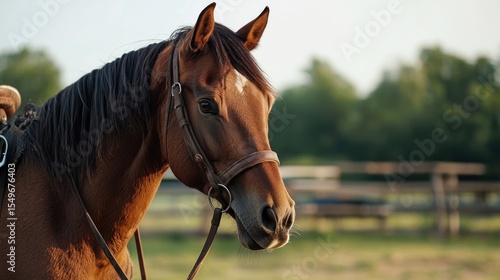 © Soem, Fototapeta premium A brown horse with a saddle on its back, standing in a field with trees in the background.