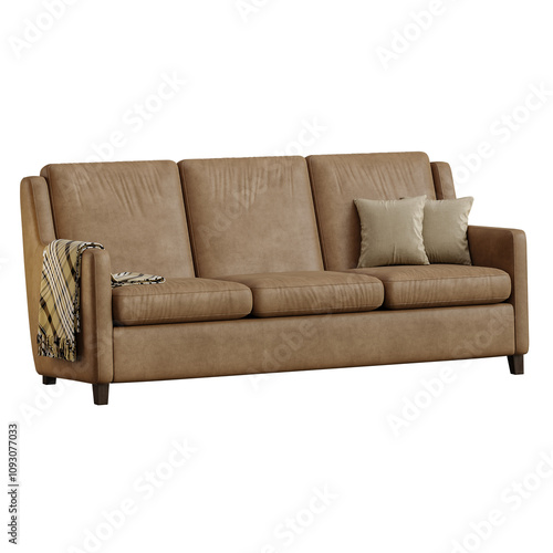 Fototapeta premium A brown leather couch with a blanket draped over it
