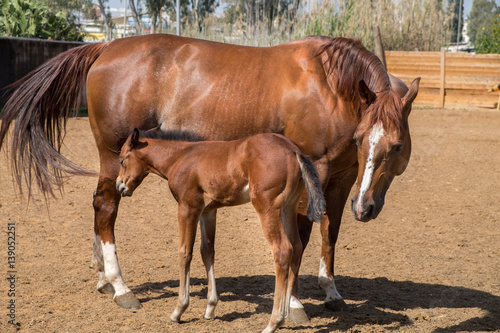 Obraz premium A brown mare and her foal at paddock