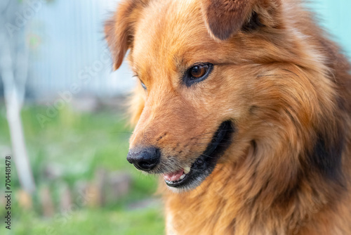 © Volodymyr, Naklejka premium A brown shaggy dog looks down with interest