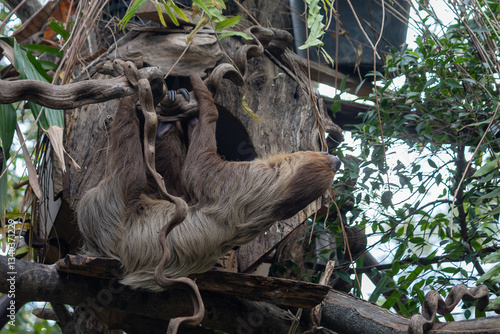 Fototapeta premium A brown sloth hangs upside down from a tree branch, its long limbs wrapped...