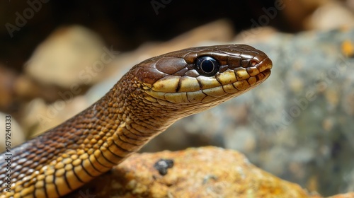 © Nany, Obraz premium A brown snake with a yellow stripe on its head, resting on a rocky surface with a blurred background.