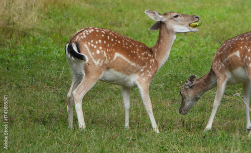 Obraz premium a brown spotted fallow deer (dama dama) fawn eats a green pear in a grassy...