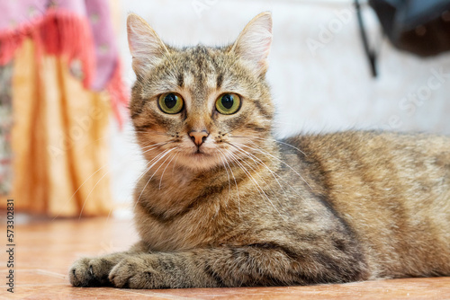 © Volodymyr, Obraz premium A brown tabby cat is lying on the floor in the room