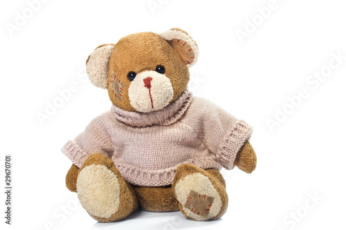 © sissyphoto, Obraz premium a brown teddy bear with patch on a head sited on white