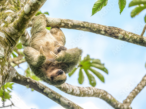 © CL-Medien, Fototapeta premium A brown throated 3 toed sloth hanging i a tree with a Baby in Costa Rice Rainforest national park
