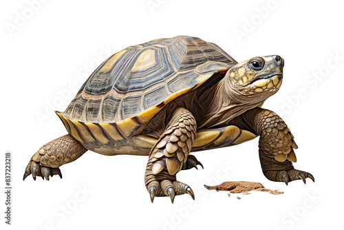 © Green Creator, Obraz premium A brown tortoise with yellow markings on its shell, walking forward on a white background.