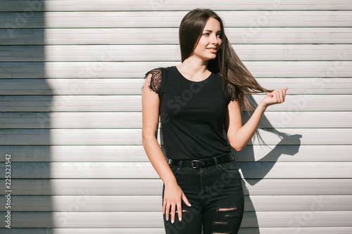 © andrew_shots, Fototapeta premium A brunette female with long hair wearing a blank black t-shirt i while standing on a concrete wall background on a street. Empty space for text or design.