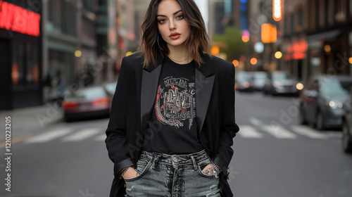 Fototapeta premium A brunette woman in an oversized black blazer, graphic T-shirt, and distressed jeans, standing stylishly on a busy city street