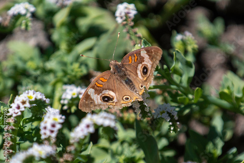 Fototapeta premium A buckeye butterfly getting nectar from a flower in a park