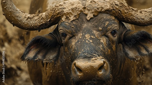 © saefur, Naklejka premium A buffalo bull, Syncerus caffer, close up of an animal head and horns covered in mud. --ar 16:9 --v 6.1 Job ID: 6b8a1838-cffe-43ce-a7a3-539898394611
