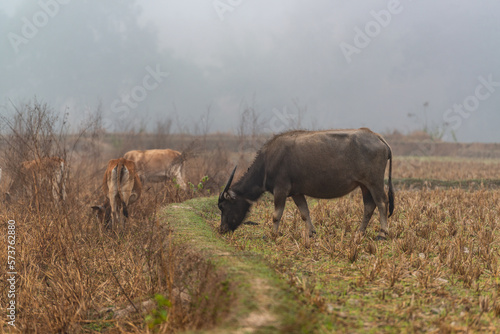 © ULTRAPOK, Fototapeta premium A buffalo is grazing in the harvested field in the mist morning at Mueang Khong, Chiang Dao, Chiang Mai, Thailand.