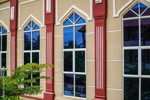© Pernandi Imanuddin, Fototapeta premium A building's architecture featuring arched windows reflecting the sky and greenery, accented by red pillars, and cream walls offering a blend of natural and constructed elements in design.