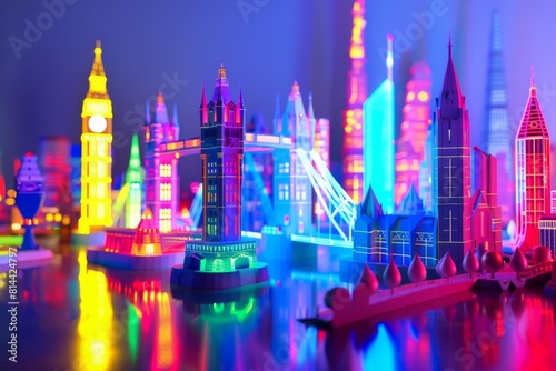 Obraz premium A building with a blue and orange design is shown in a blurry image