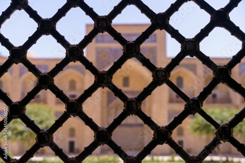 © oybekostanov, Naklejka premium A building with a blue and white roof