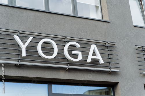 © Aleksey, Obraz premium A building with a sign for yoga classes, yoga text hanging on the wall, a sign of a club of oriental practices, advertising on the street, white letters in the name of yoga.