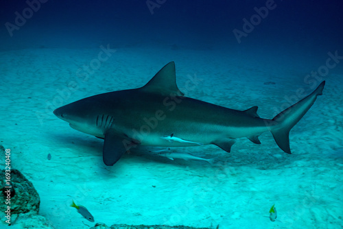 Obraz premium A bull shark with pilot fish in the Caribbean Sea near the coast of Playa del Carmen on the Yucatan Peninsula in Mexico