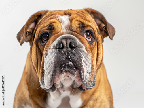 Obraz premium A Bulldog with its iconic wrinkled face, white studio backdrop