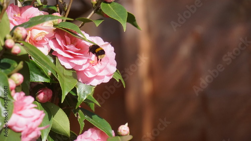 © Jade, Obraz premium A bumblebee flying towards a large pink rose in a summer garden