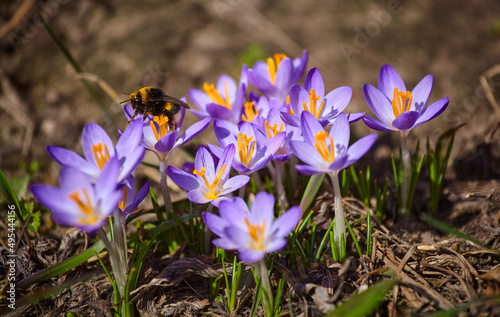 Fototapeta premium A bumblebee gathers pollen in a blooming spring crocus flower