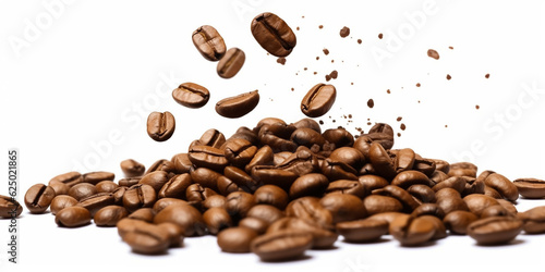 Naklejka premium A bunch of coffee beans and falling coffee beans on a white background
