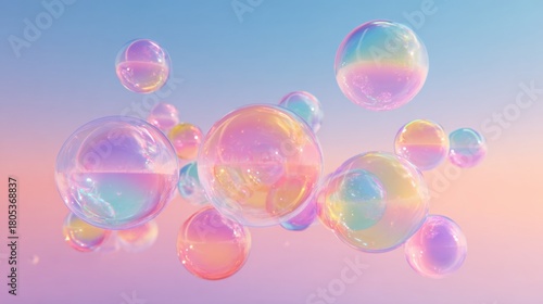 © mila103, Naklejka premium A bunch of colorful bubbles floating in the air. The bubbles are of different colors and sizes, creating a vibrant and playful atmosphere. Concept of joy and wonder, as if the bubbles are dancing