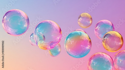 © mila103, Obraz premium A bunch of colorful bubbles floating in the air. The bubbles are of different colors and sizes, creating a vibrant and playful atmosphere. Concept of joy and wonder, as if the bubbles are dancing