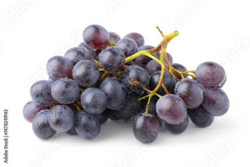 © Constantinos, Fototapeta premium A bunch of dark-purple grapes, glistening with water droplets, sits against a bright white background.