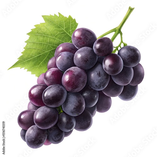 Fototapeta premium A bunch of dark purple grapes with a green leaf, isolated on white background