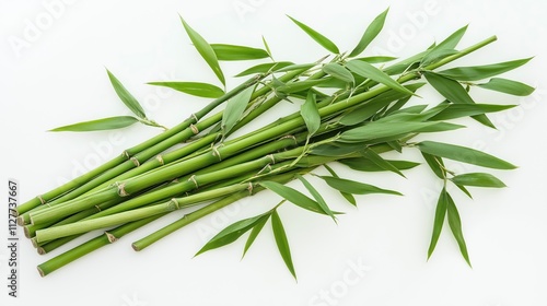 Fototapeta premium A bunch of fresh green bamboo sticks with leaves on a white background.