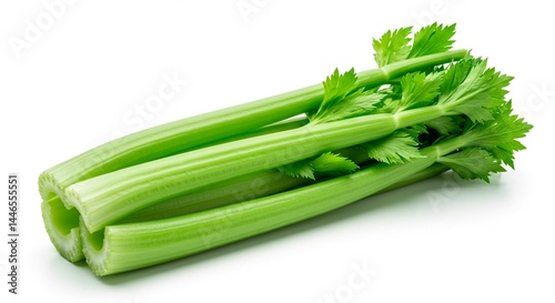 © Steffani, Fototapeta premium A bunch of fresh green celery stalks with leaves on a white background in a bright studio shot image