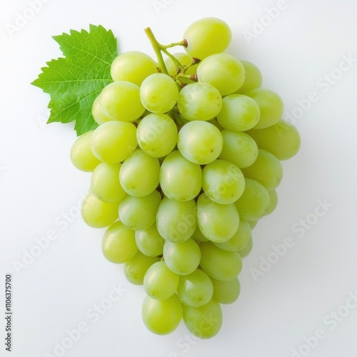 © starush, Obraz premium A bunch of fresh green grapes with a single leaf on a white background, AI