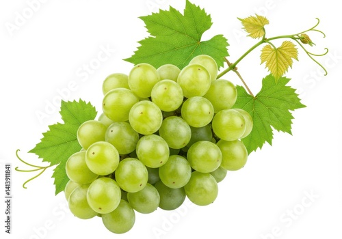 © Laki, Fototapeta premium A bunch of green grapes with leaves isolated on a white background in a close up studio shot