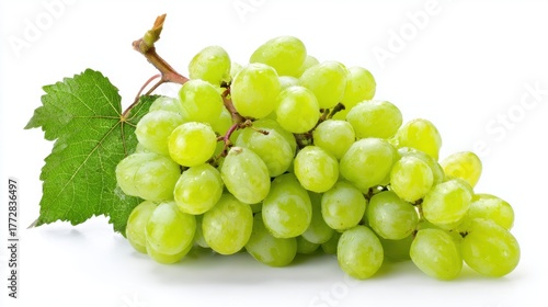 Obraz premium A bunch of plump green grapes hangs from a vine, showcasing their fresh and juicy appearance. The bright green color and leaves indicate a summer harvest.