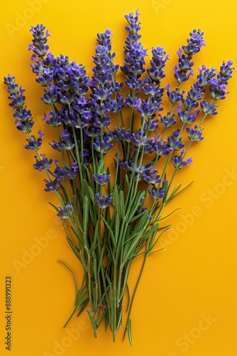 Naklejka premium A bunch of purple lavender flowers are arranged on a yellow background. The...