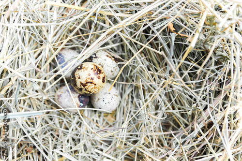 © vzwer, Obraz premium A bunch of quail eggs in hay. Top view.