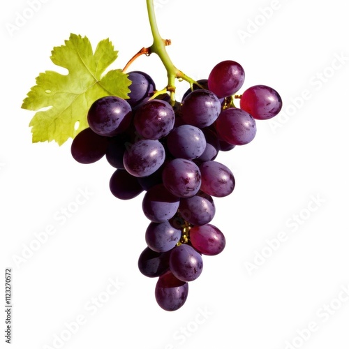 Fototapeta premium A bunch of ripe grapes hanging from a vine with a green leaf.